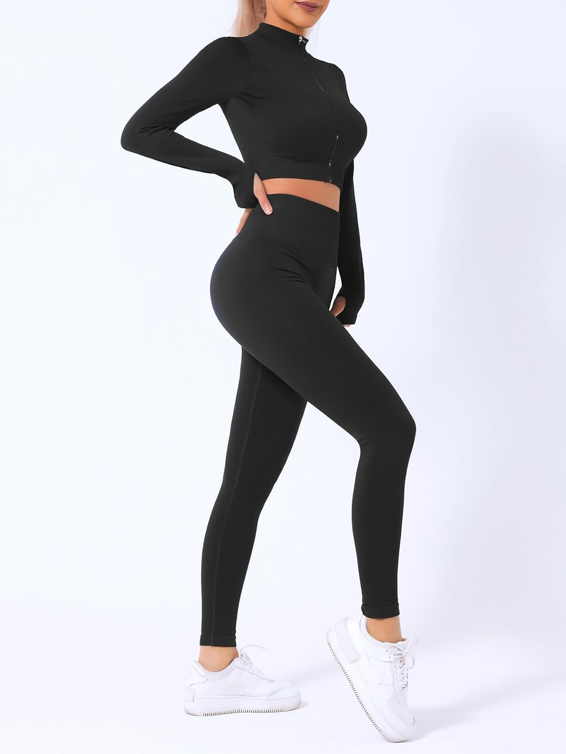 2 Piece Workout Sets for Women Seamless Workout Sets with Zip Bra Butt Lifting Leggings Waist Yoga Leggings Sets