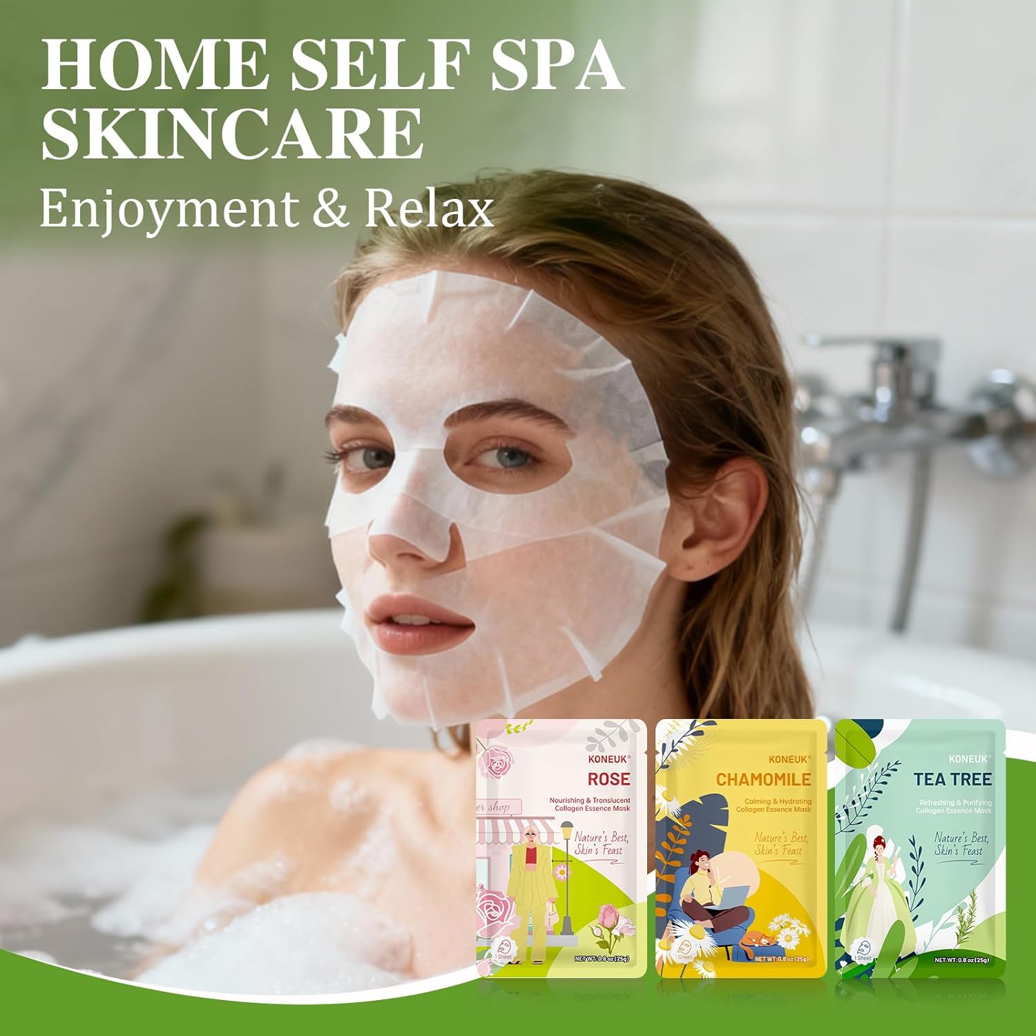 【27 Pack Sheet Face Mask Set】Our face masks skincare includes 9 different types:camellia,lavender,seaweed,pomegranate,strawberry,rose,chamomile,green apple,tea tree,9 types x 3 pcs.Whether your skin is oily,dry or normal,this face mask set can meet your needs,make your skin hydrated and smooth after use