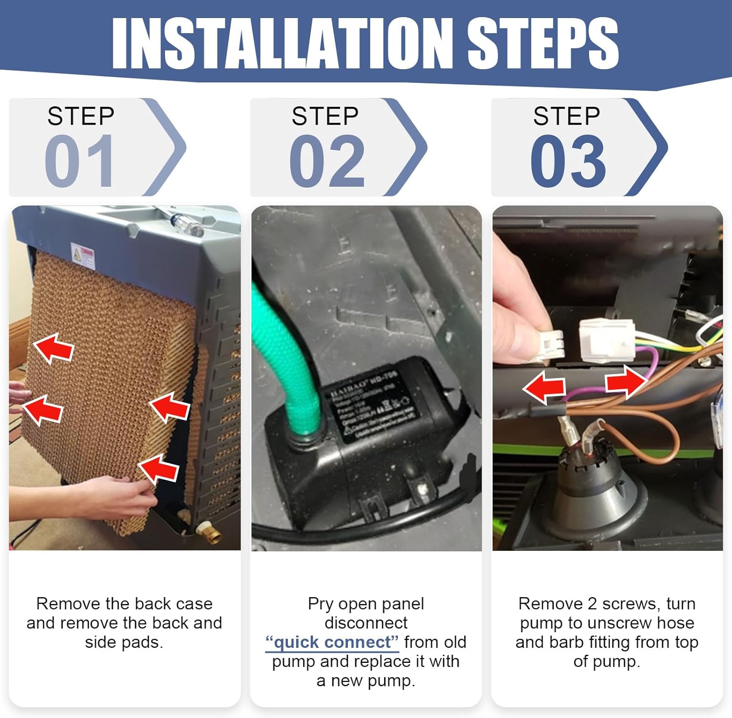 EASY INSTALLATION – ①. Remove the back case and remove the back and side pads; ②. Pry open panel disconnect “quick connect” from old pump and replace it with a new pump; ③. Remove 2 screws, turn pump to unscrew hose and barb fitting from top of pump