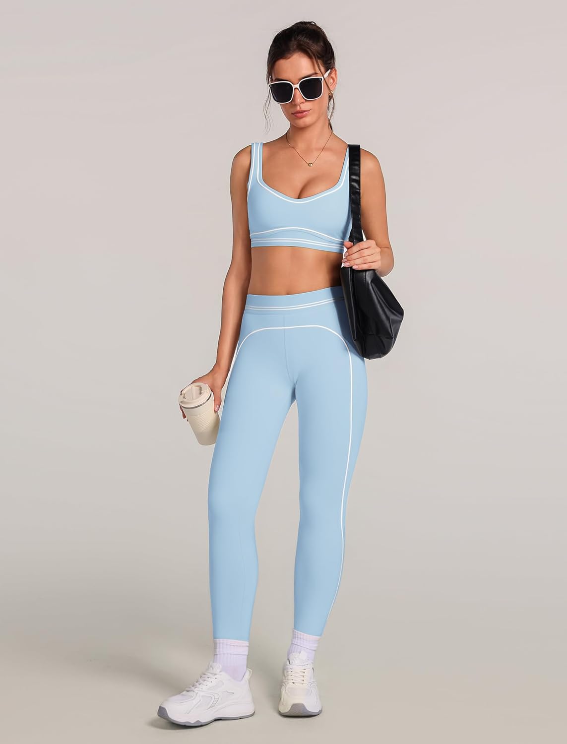 This set looks and fits great. The material has lots of stretch, the white details is perfect for giving it a modern and lux vibe, without that lux price tag. Overall, the fit was great, I got a size L and it fits as expected. I will use this to do pilates so the top will be fine. This is definitely not for HIIT type of workouts, more like low impact. Overall, it’s a cute set and I cannot wait to wear it out to my next pilates class.