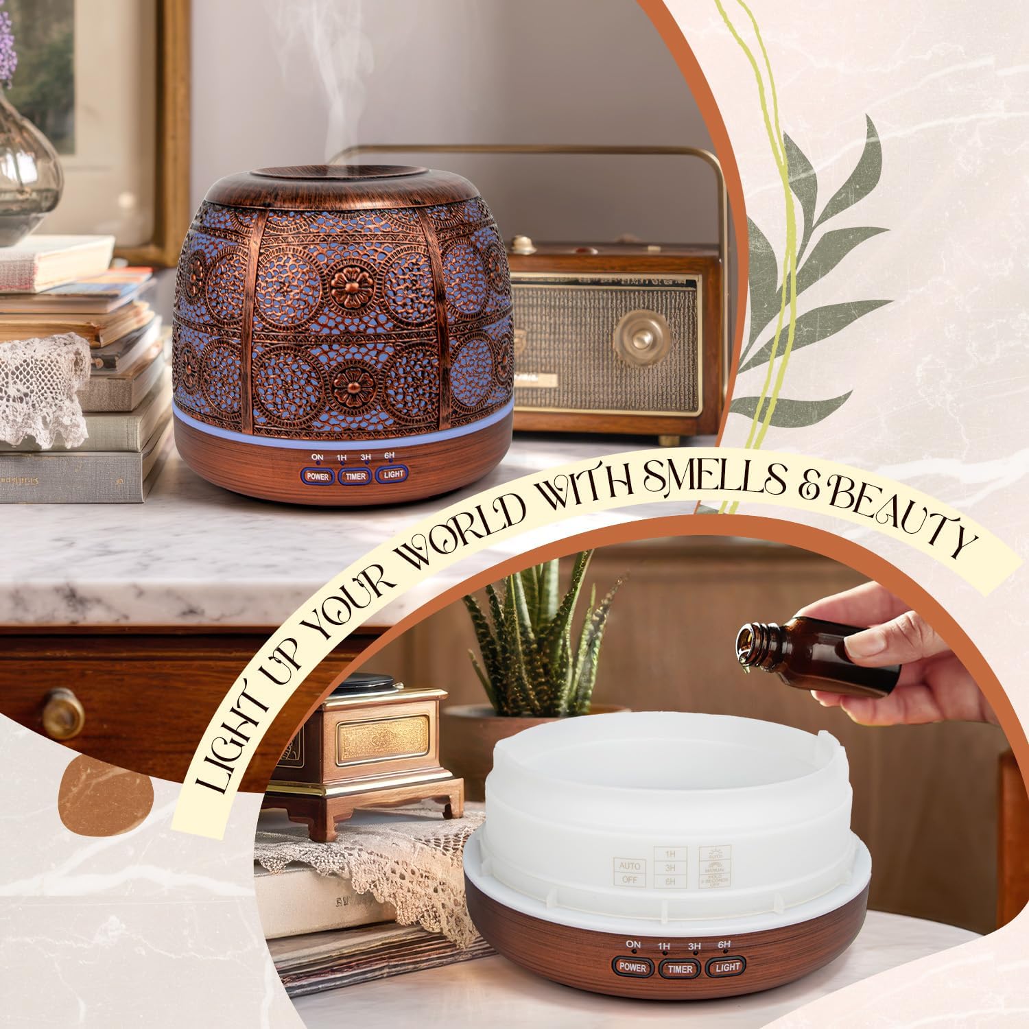 Designed for both aesthetic appeal and practicality, our oil diffuser utilizes ultrasonic technology to disperse your favorite essential oils into the air, creating a serene atmosphere in any room of your home. Whether you’re looking to unwind after a long day, enhance focus during work or study sessions, or simply infuse your space with delightful fragrances, our diffuser is here to elevate your experience.
