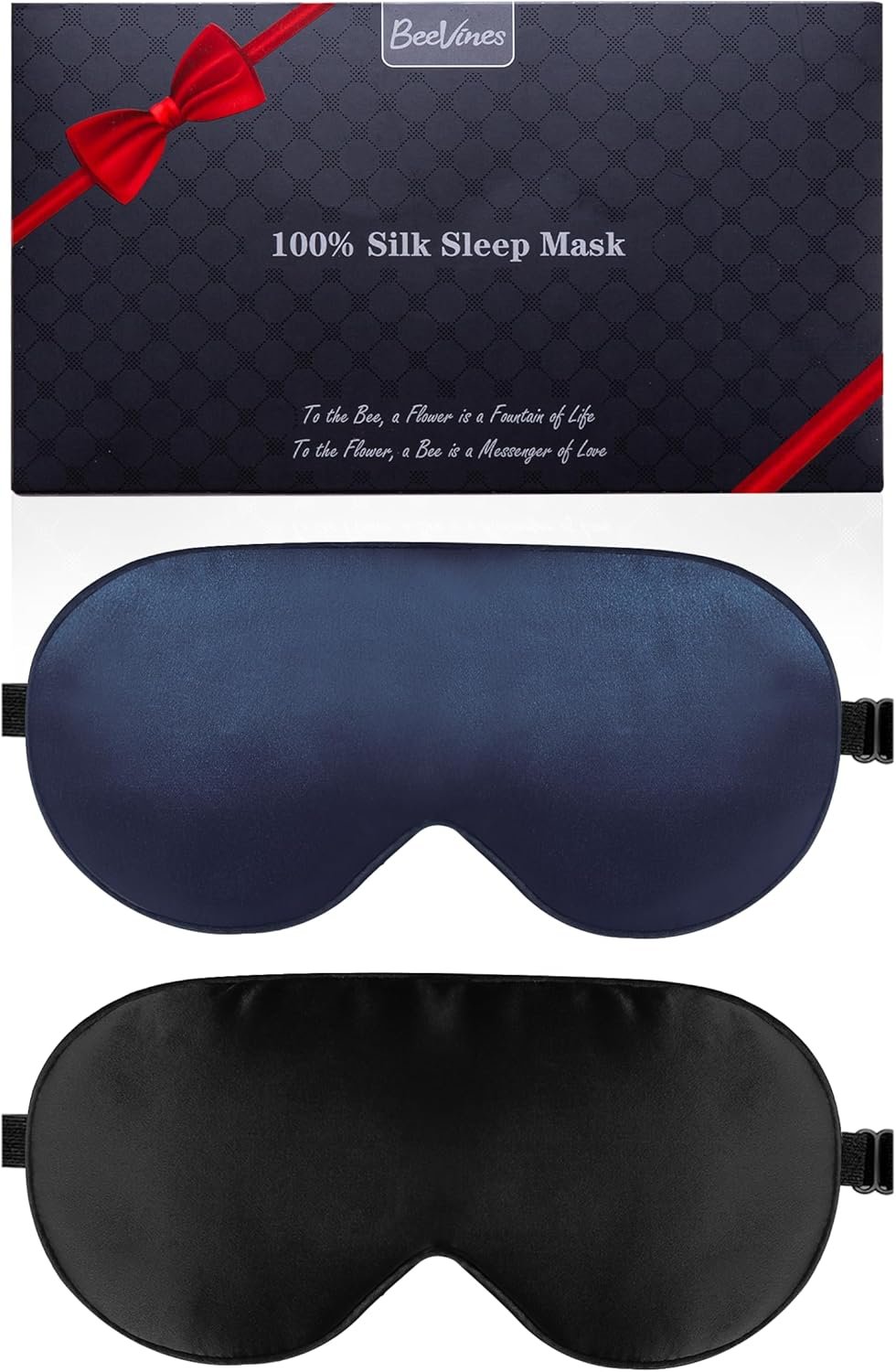 BEEVINES SLEEPING MASKS 💯 Mulberry SilkThey feel Light Soft Silky.Produnt use of both sides Comfortable adjustable for comfortFull Blackout coverage.Nicely Priced for Comfortable Sleeping Mask Comes in a package of 2 Black masks. One has a black & pink side