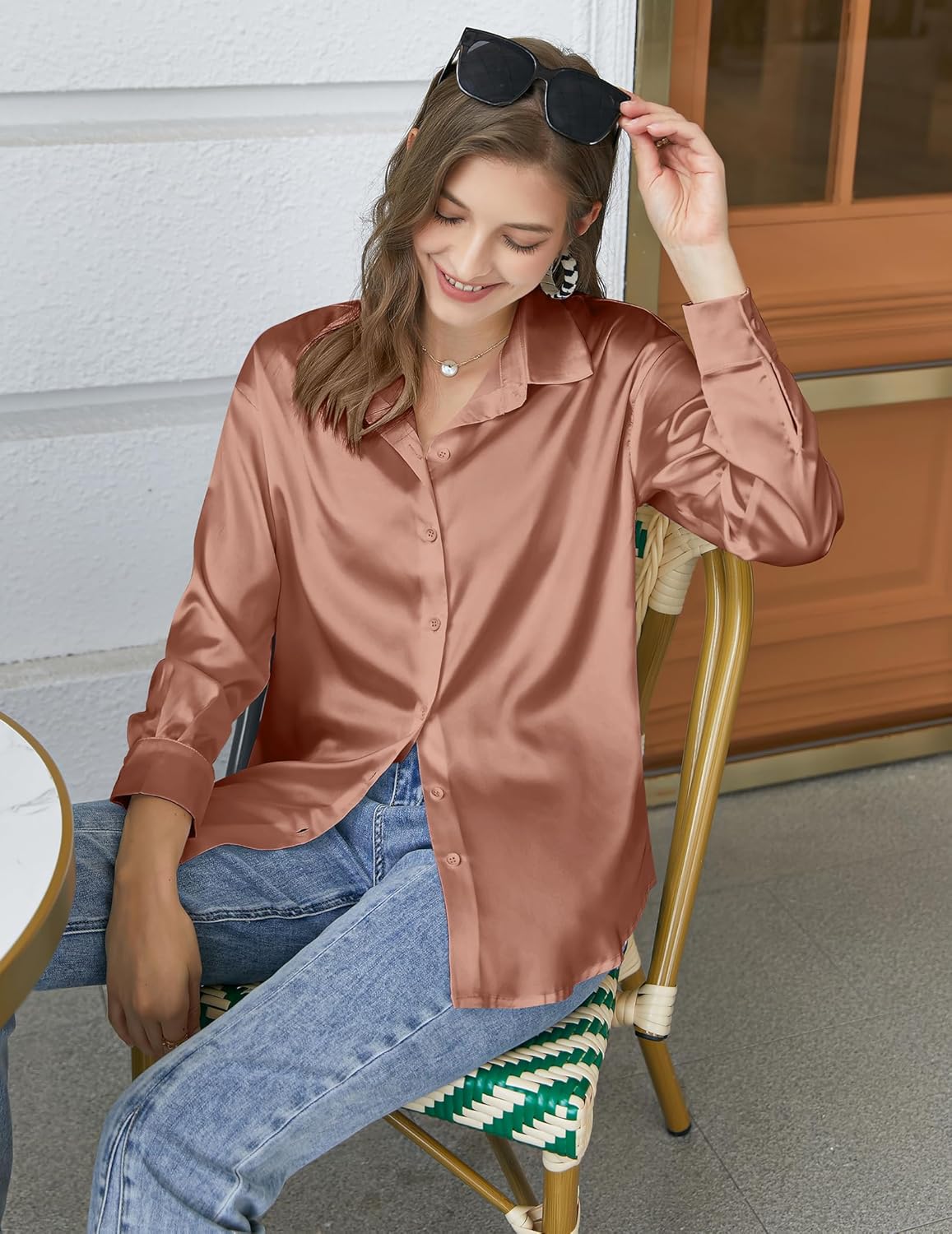 Chigant Satin Silk Blouse Casual Long Sleeve Button Down Shirts Work Tunic Tops