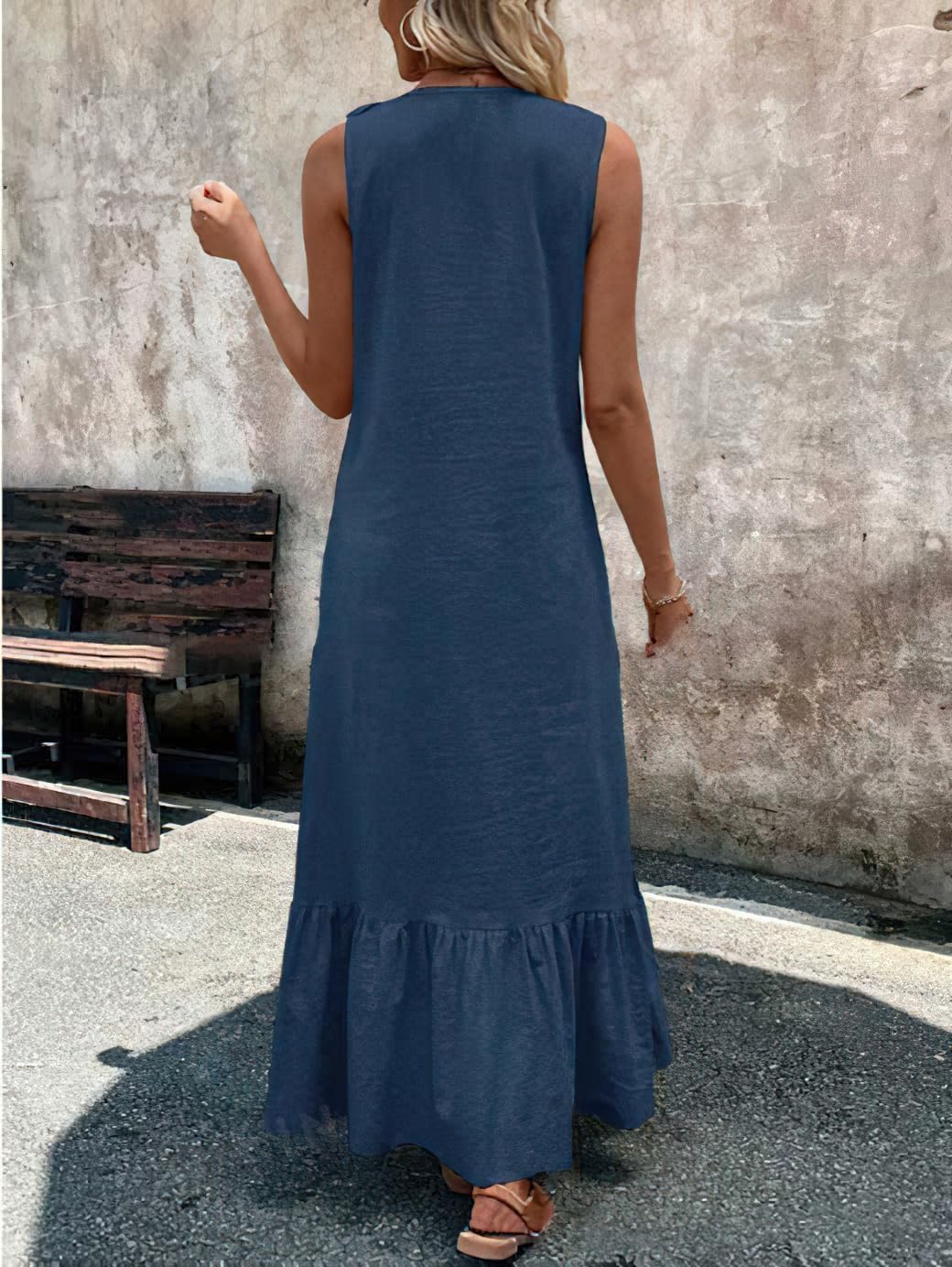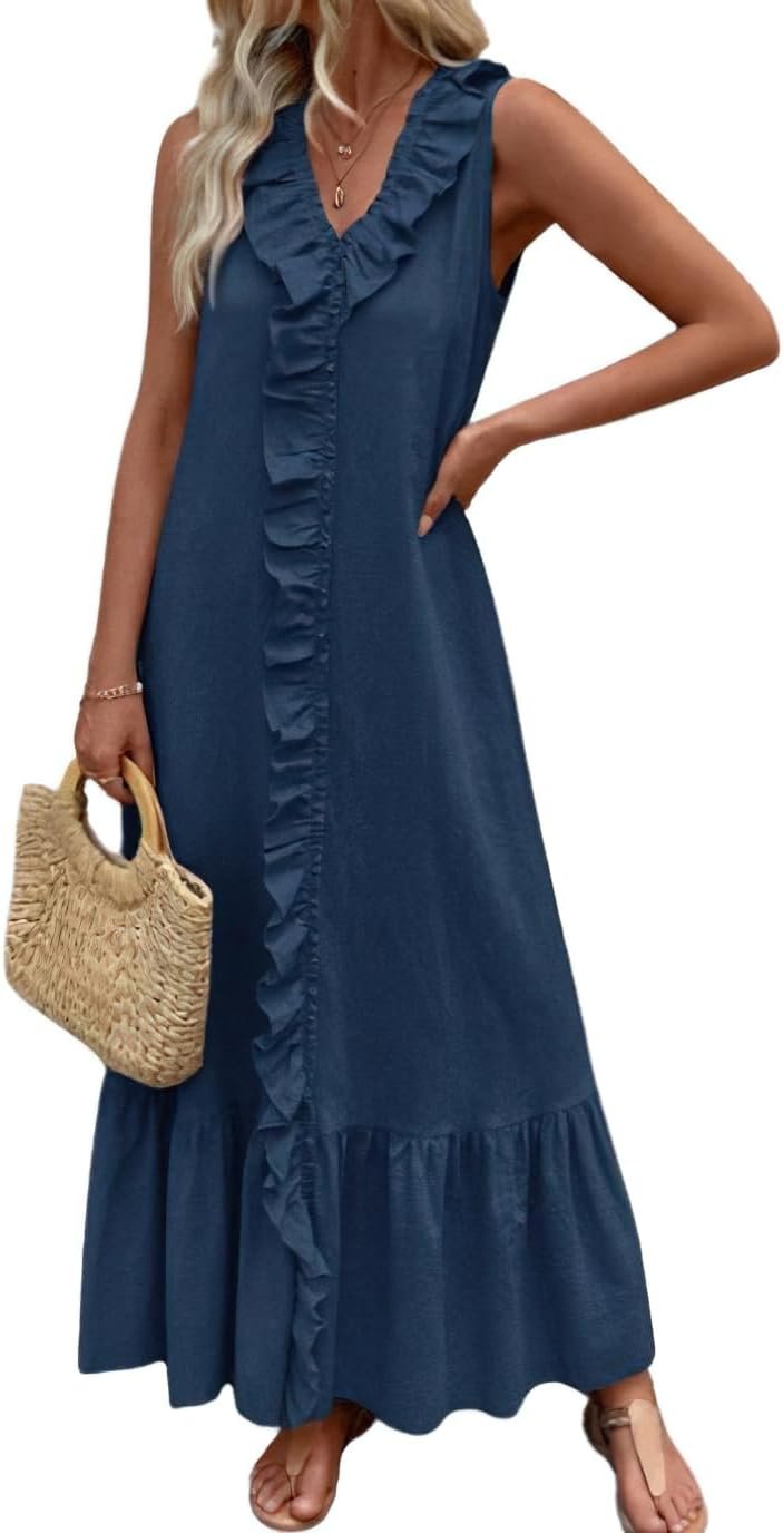 chouyatou Women’s Summer Beach Cotton Tank Dress Linen Boho Sleeveless Tiered Ruffle Maxi Long Sundress