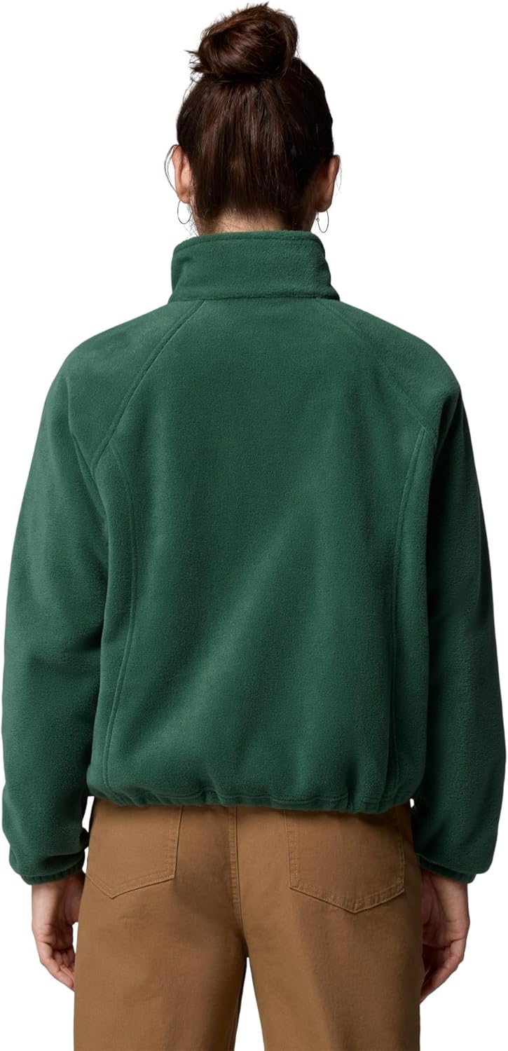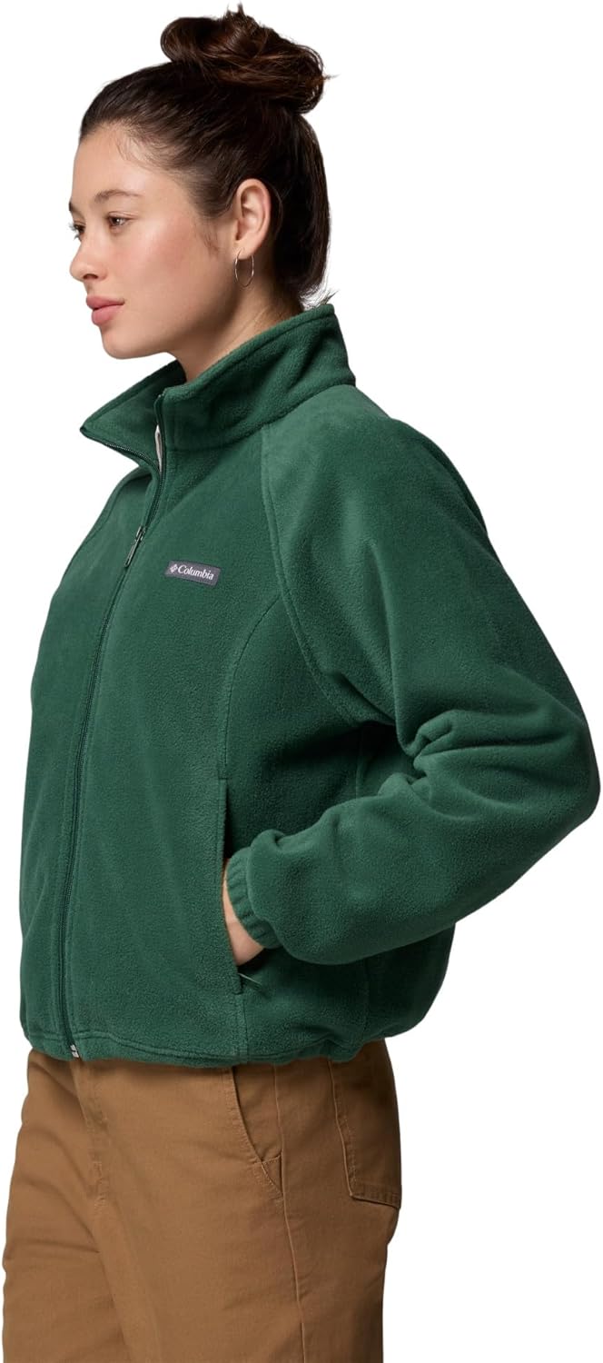 For a Columbia jacket-this was a big disappointment to me. It’s just so short. It doesn’t look cropped in the ad pictures or mention being cropped in the title but it is definitely too short and that makes this unwearable for me. The fleece fabric is also more rough than usual for Columbia. If you’re ok with a cropped jacket this might be for you-it does have some nice features like zippered outer pockets, 2 inner pockets (not sure if they are ‘happy accidents’ or intentional but the lining of the zippered pockets make for the inner pockets), a drawstring elastic bottom to adjust waist size and a full front zipper.