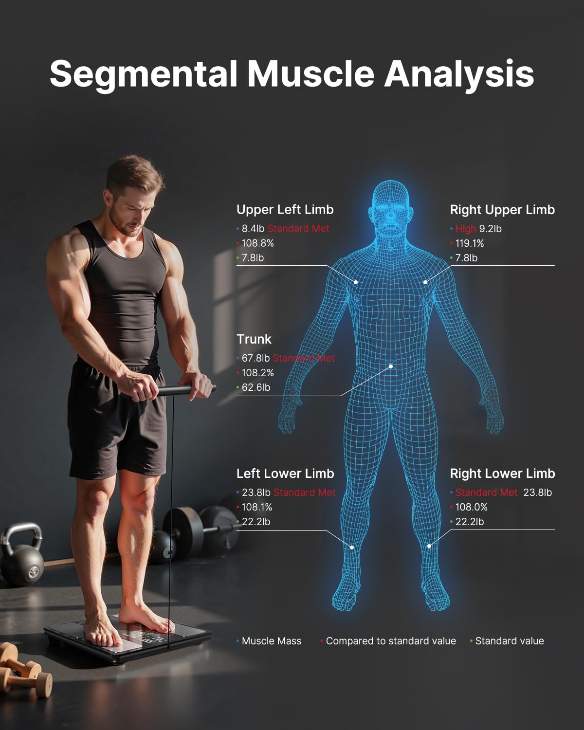 Targeted Fitness Insights: This body fat scale lists out the segmental muscle and fat of left arm, right arm, trunk, left leg and right leg instead of just analyzing body composition for the whole body, which helps you create a specific exercise plan.