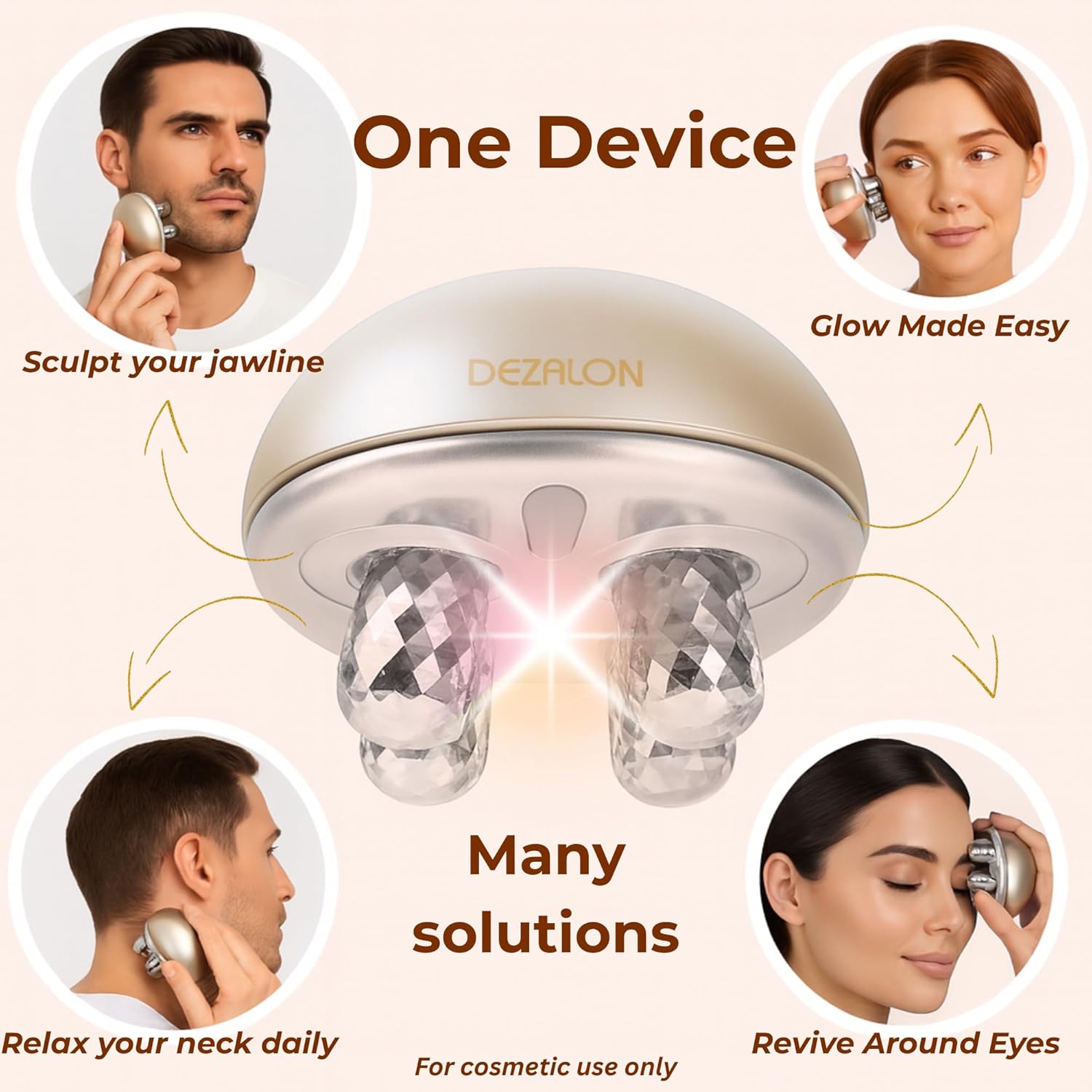 4-in-1 Beauty Innovation – All-in-one cosmetic microcurrent facial device featuring a face roller, neck massager, jawline sculpting tool, and eye care attachment — crafted for effortless use and elegant design. Compact and perfect for travel or your beauty space.