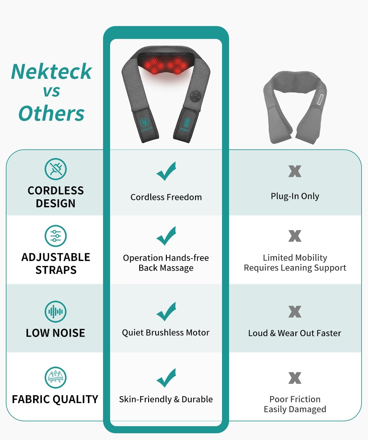 PORTABLE AND CORDLESS: Nekteck neck massager with heat is designed to be cordless, making it convenient to use anywhere without worrying about cords or finding a power source. Ergonomic Design to fit the curves of the neck, ensuring maximum comfort and effectiveness.
