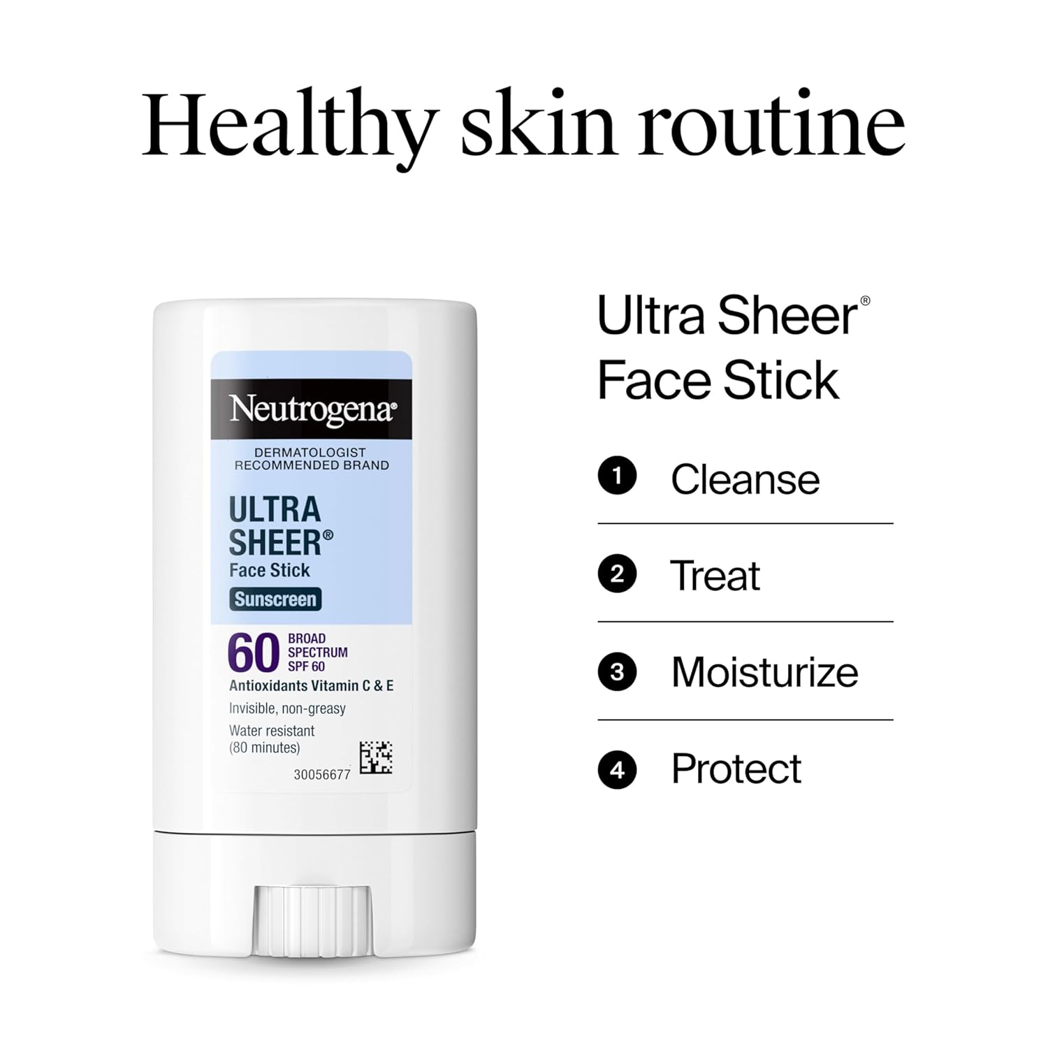 Neutrogena Ultra Sheer Face Sunscreen Stick SPF 60, Sensitive Skin Care, Mess-Free Broad Spectrum Sun Protection, Water Resistant Travel Size Sunscreen for Face, Oxybenzone-Free, .47 oz