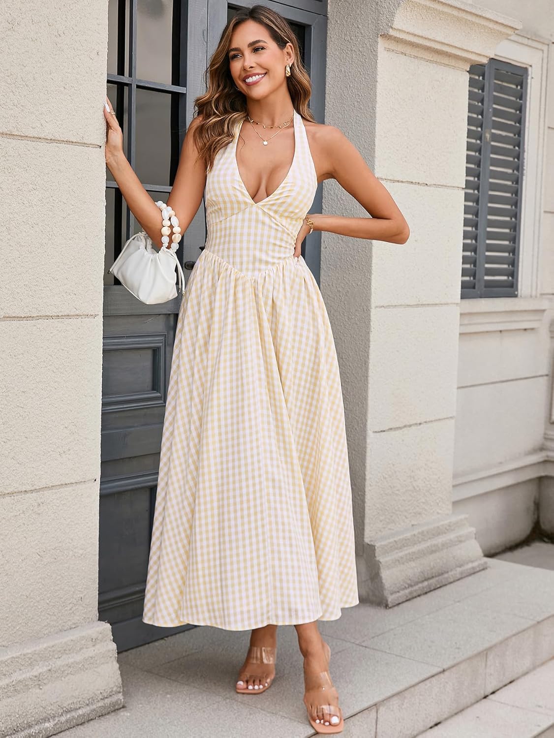 Fashion Style: Halter Neck/Deep V Neck/Gingham/A-line Hem