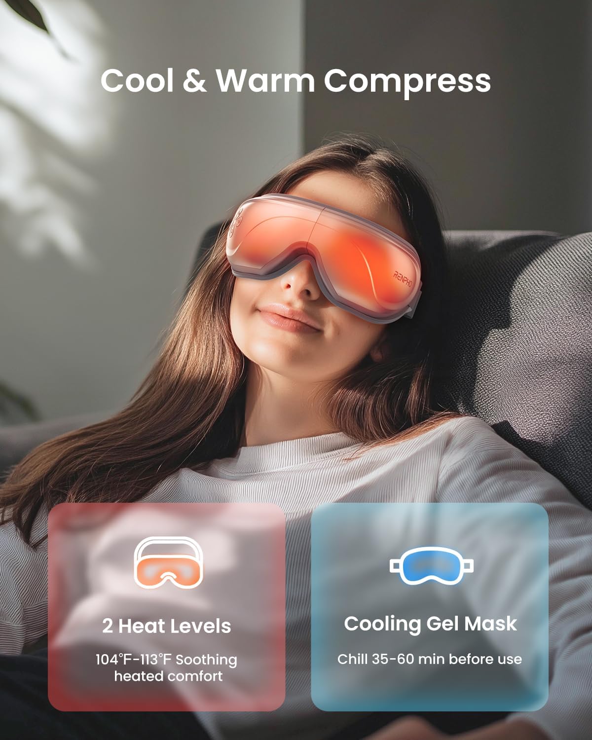 Soothing Heating & Cooling Eye Therapy: Experience customizable comfort with 2 adjustable heat settings (104°F-113°F/40°C-45°C) to effectively relieve puffiness, dry eyes, and tension. For cooling relief, simply chill the removable gel mask (35-60 minutes in freezer) and enjoy instant refreshment that reduces eye strain and fatigue. The ergonomic design features extended massage pads and an adjustable headband for a perfect, personalized fit that accommodates most users.