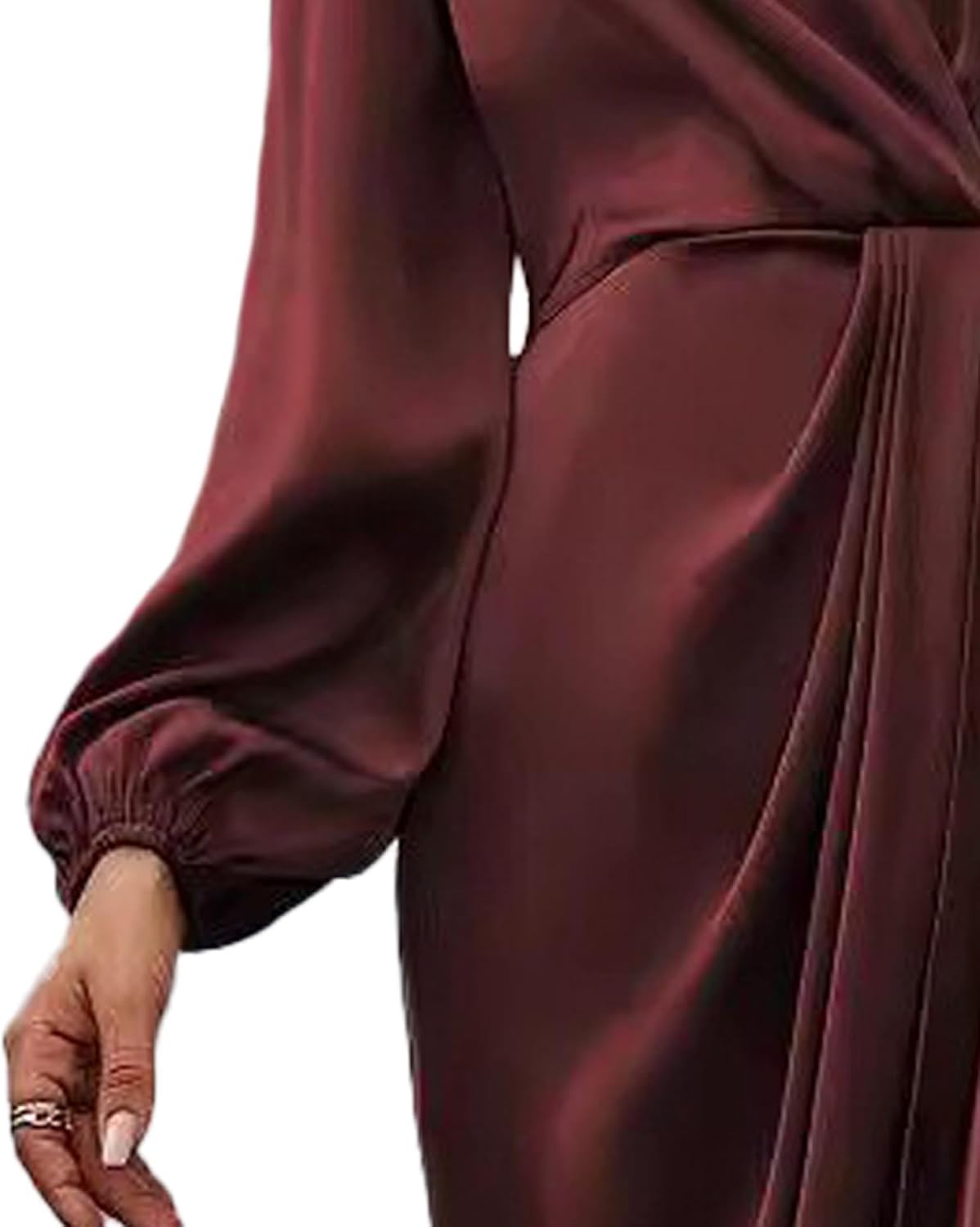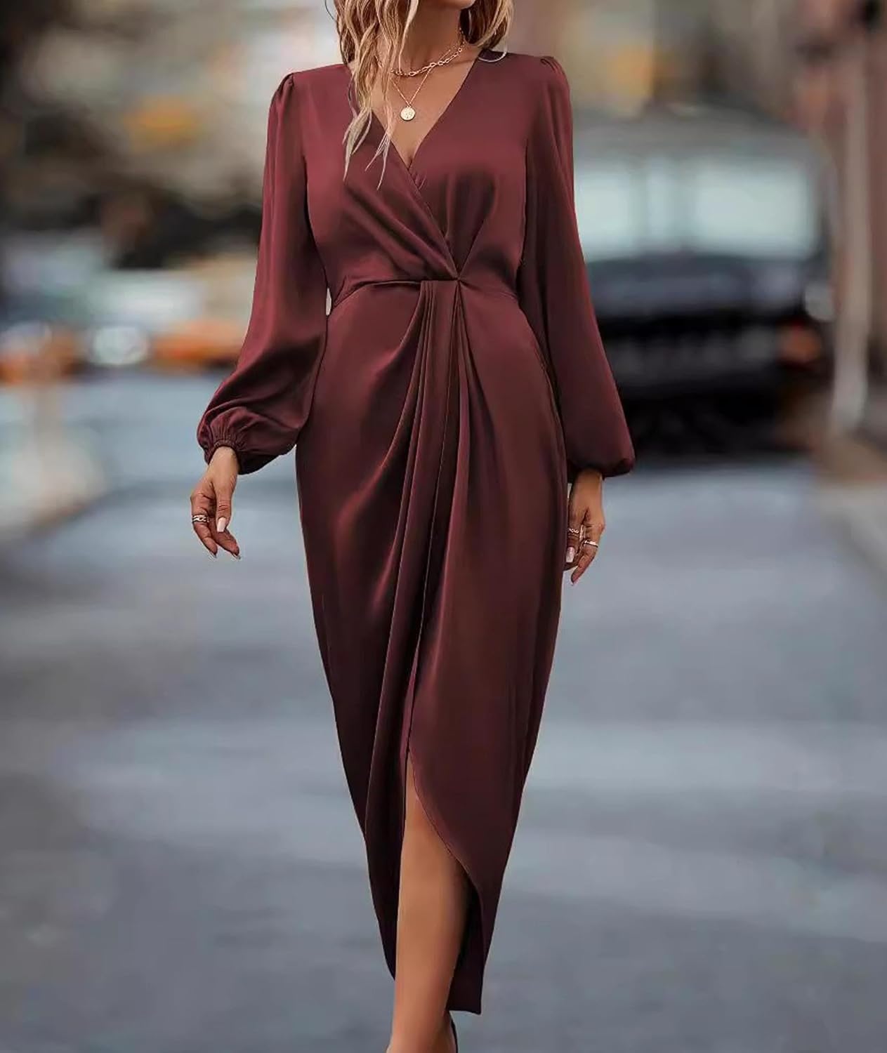 Sexyshine Women’s Wrap V Neck Long Sleeve Satin Midi Dress Split Hem Ruched Pleated Formal Evening Party Dresses