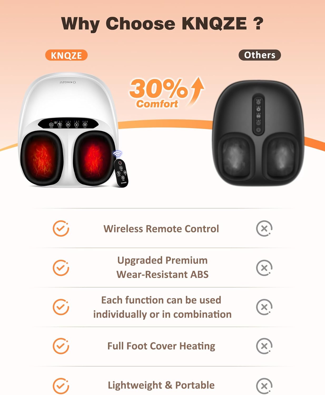 I recently got the KNOZE Foot Massager (Model KF7), and I absolutely love it! From the moment I put my feet in, I could feel the difference. It has different intensity settings for kneading and air compression, which really helps relieve my tired feet after a long day. The heat function is a bonus – warm and cozy, especially in colder weather.The design is sleek, and it’s super easy to use with clearly labeled buttons and a digital timer. I also appreciate how quiet it runs, so I can enjoy a foot massage while watching TV or reading.
