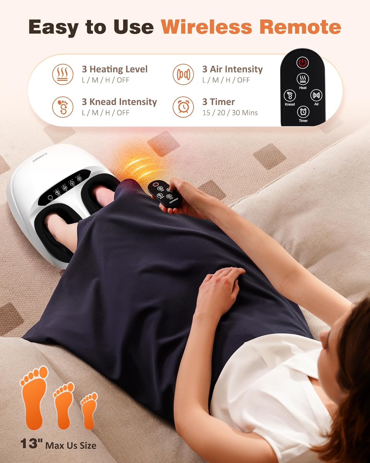 This foot massager is a game changer! The deep kneading and soothing heat melt away tension after a long day, and the adjustable compression feels just like a professional massage. I love that it has multiple modes and an auto-off timer for convenience. The remote control makes it super easy to use without bending down. It’s quiet, powerful, and incredibly relaxing—perfect for anyone who spends hours on their feet. Definitely one of the best self-care gifts you can give or receive!