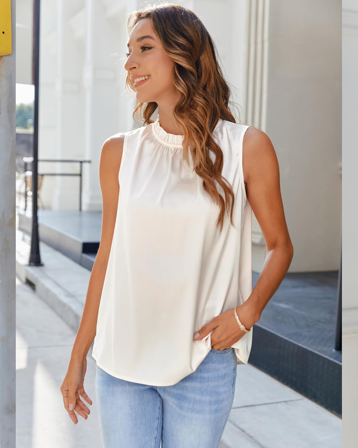 Simplefun Women’s Satin Sleeveless Blouse Dressy Casual Mock Neck Silk Tank Tops