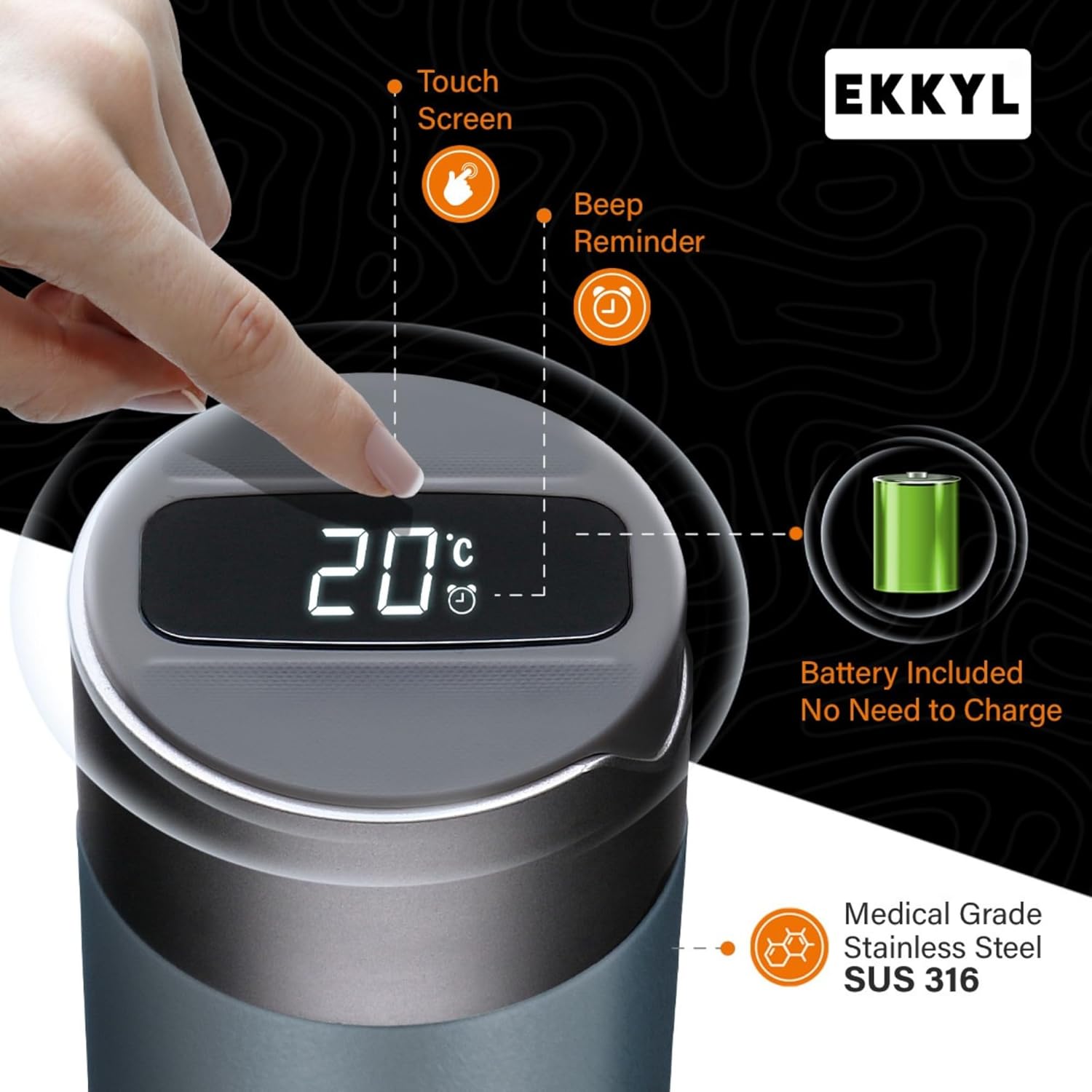 Revolutionize your daily hydration with the Ekkyl Smart Water Bottle, designed for those who seek functionality, style, and technology in one product. This stainless steel water bottle with a 16.2 Oz (480ML) capacity combines innovative features with premium materials.
