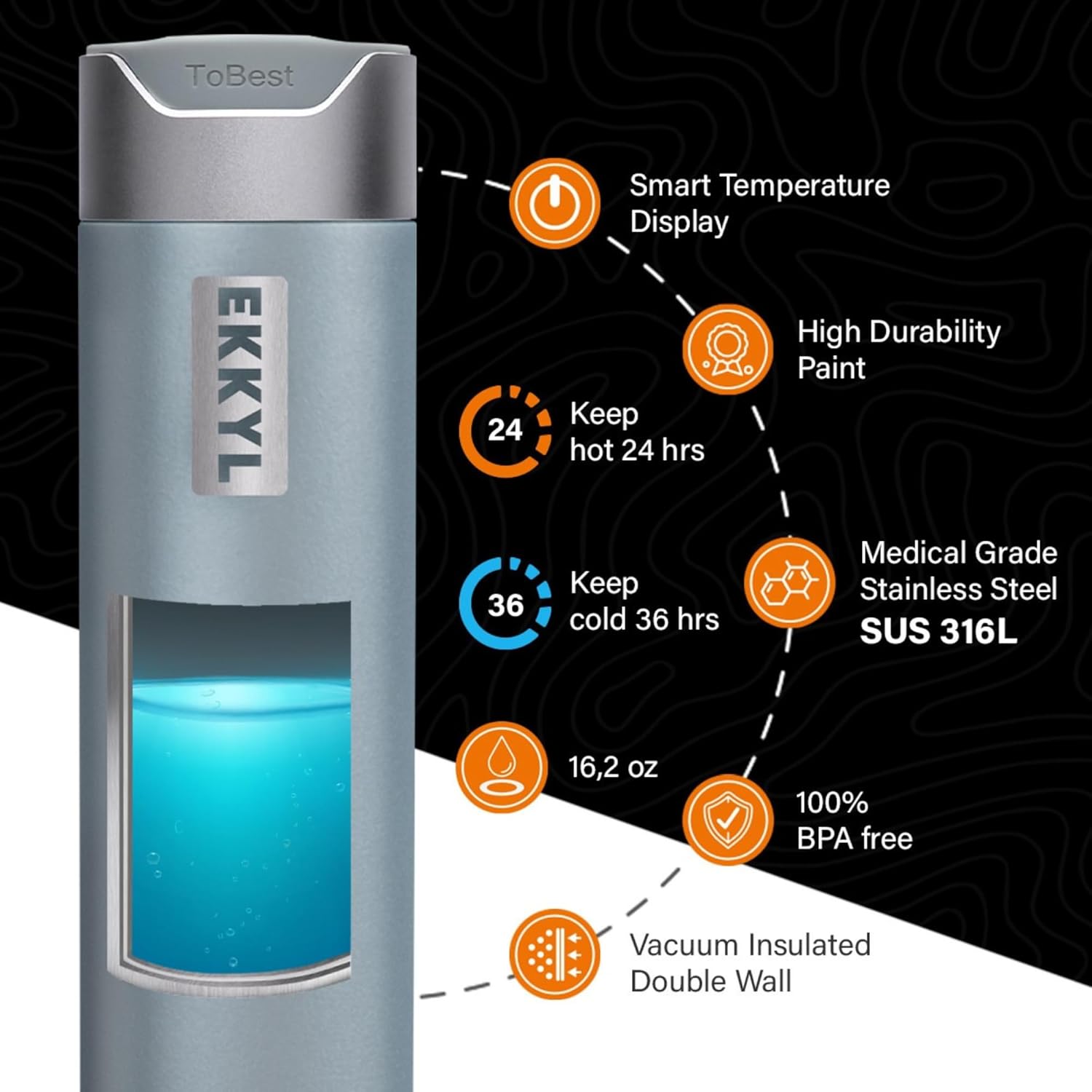 Revolutionize your daily hydration with the Ekkyl Smart Water Bottle, designed for those who seek functionality, style, and technology in one product. This stainless steel water bottle with a 16.2 Oz (480ML) capacity combines innovative features with premium materials.