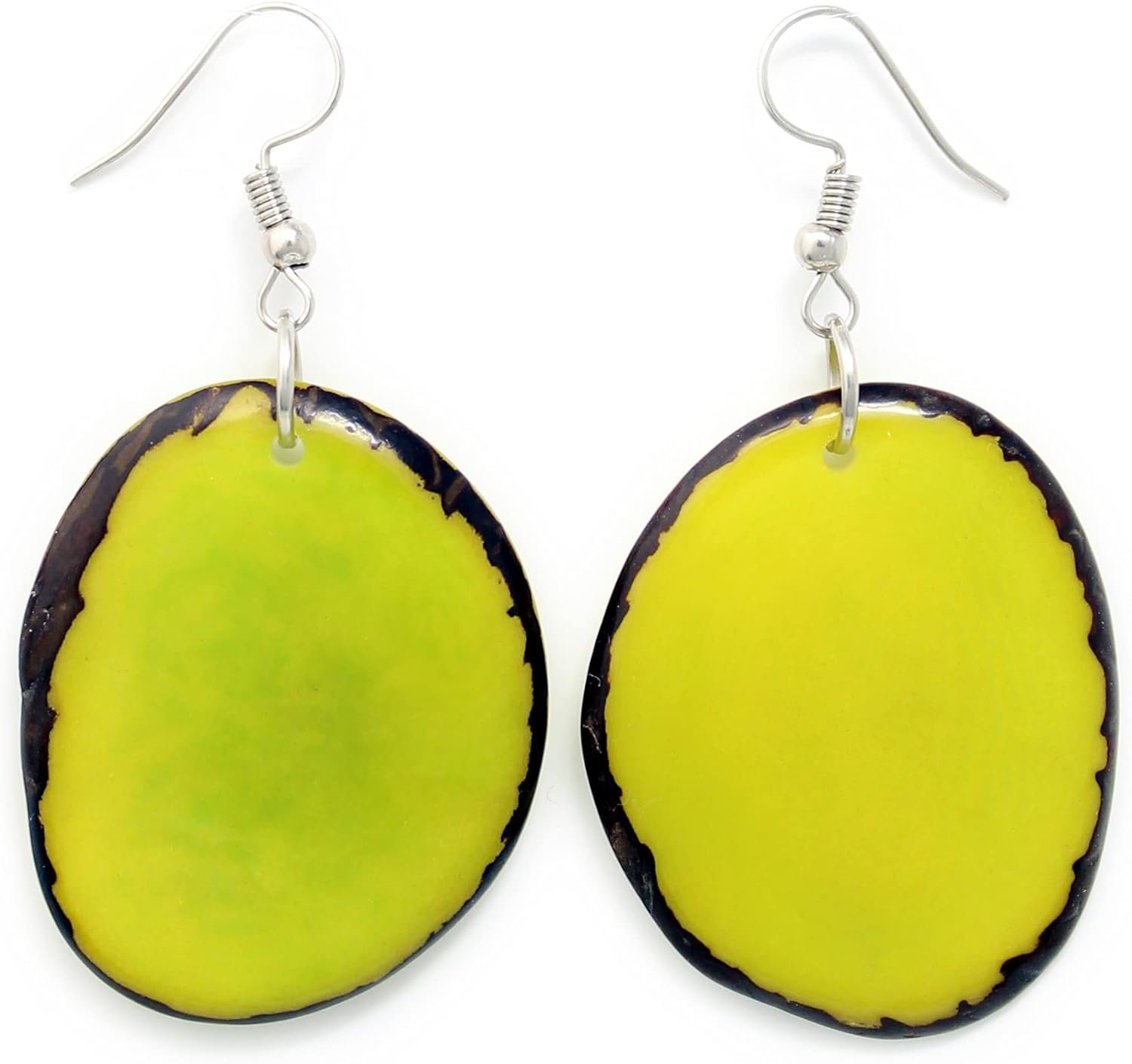 These naturally beautiful earrings are rounded Tagua chips with rind on the edges, dyed lime green (Surgical steel findings). Our lime green tagua nut earrings are fun and uncommon, a natural chic accessory that goes well with any outfit. Each tagua chip is sustainable, organic, and vegan, pure vegetable ivory (Tagua seeds)