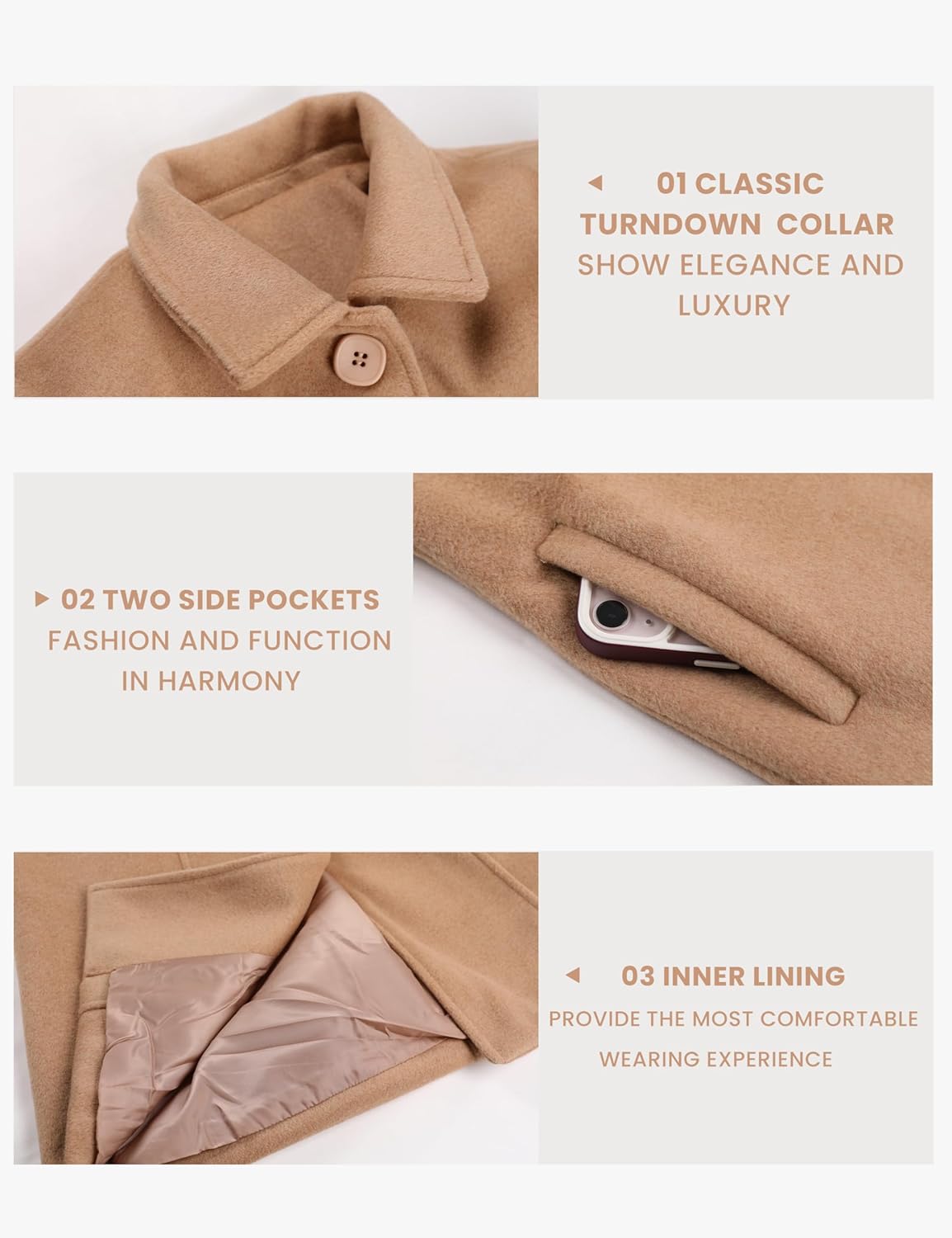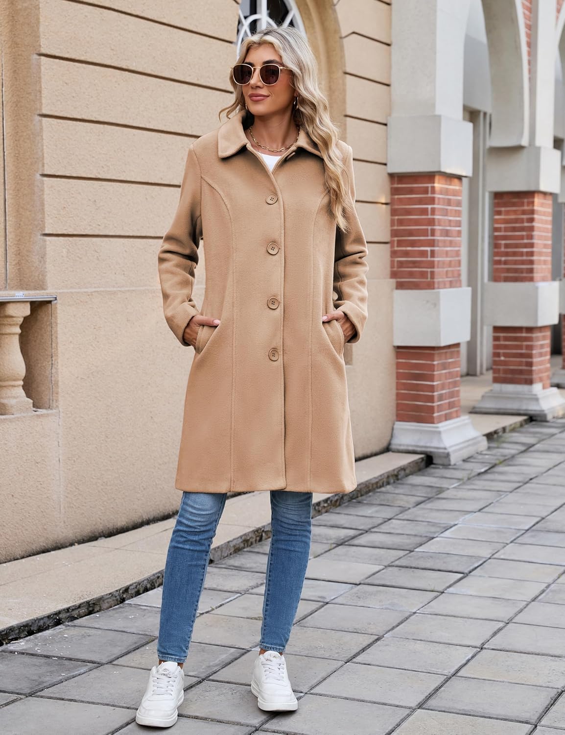 Wonderful coat! This is a heavy coat and should be perfect for wearing to church or other occasions where you want to look polished and elegant. It’s a classic color and style. Exactly the right length: I’m 5’4”, and the coat’s hemline hits just below my knees. Side pockets are nicely made and in the perfect position. I wanted a loose fit in order to wear the coat over layers. So, after reading the reviews, ordered the size recommended by the size chart according to my measurements. Great fit everywhere! Wow! The fabric is man made, which I need because of my sensitivity to wool. However, the cloth feels and looks like good-quality wool. Buttons: what a pleasure to have well-designed buttons that are stylish and easy to use! Lining: looks good, all the seams are okay. If they stretch or split after wearing, I will mend them, though they will probably hold up with normal use. I’m looking forward to wearing this coat!