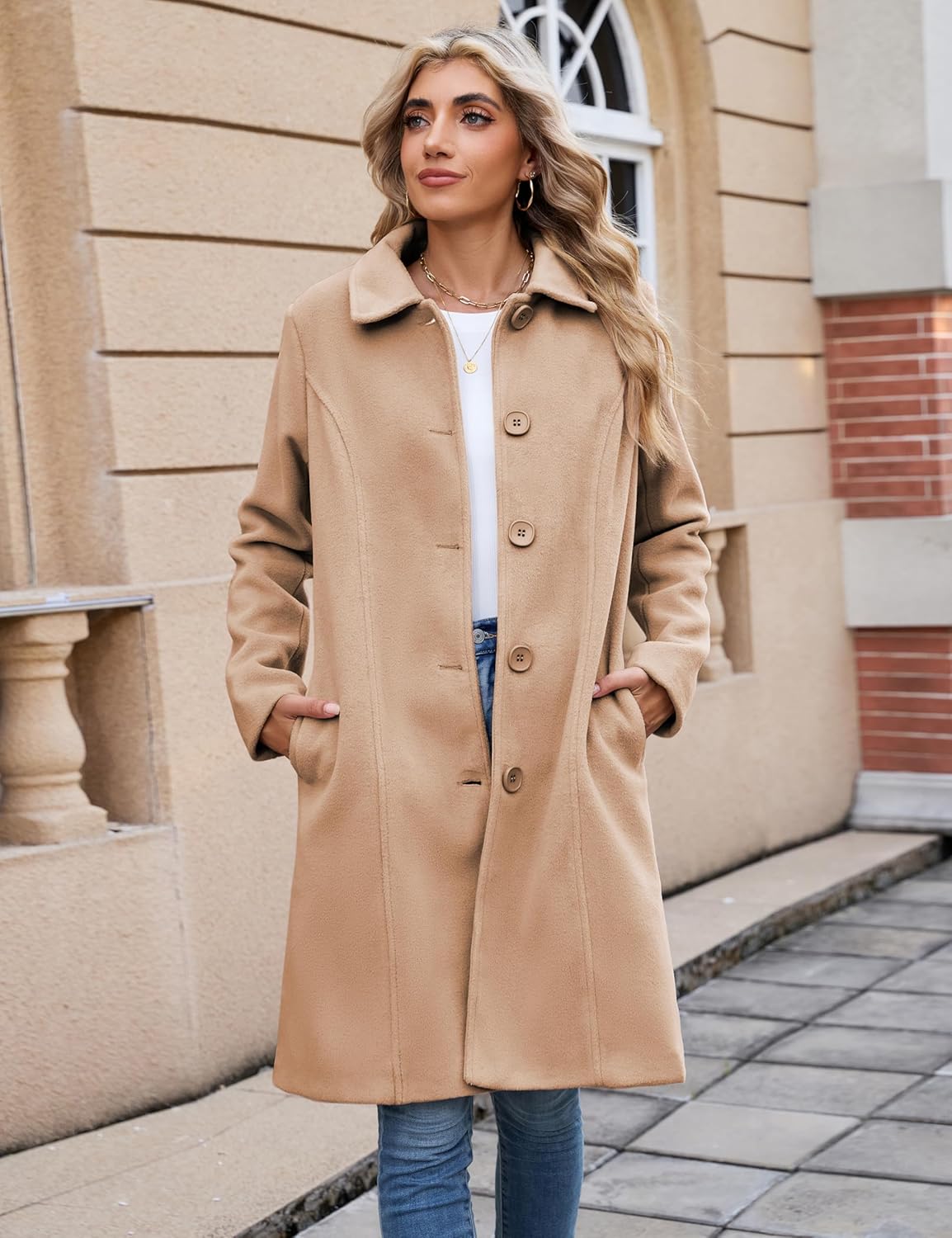 Wonderful coat! This is a heavy coat and should be perfect for wearing to church or other occasions where you want to look polished and elegant. It’s a classic color and style. Exactly the right length: I’m 5’4”, and the coat’s hemline hits just below my knees. Side pockets are nicely made and in the perfect position. I wanted a loose fit in order to wear the coat over layers. So, after reading the reviews, ordered the size recommended by the size chart according to my measurements. Great fit everywhere! Wow! The fabric is man made, which I need because of my sensitivity to wool. However, the cloth feels and looks like good-quality wool. Buttons: what a pleasure to have well-designed buttons that are stylish and easy to use! Lining: looks good, all the seams are okay. If they stretch or split after wearing, I will mend them, though they will probably hold up with normal use. I’m looking forward to wearing this coat!