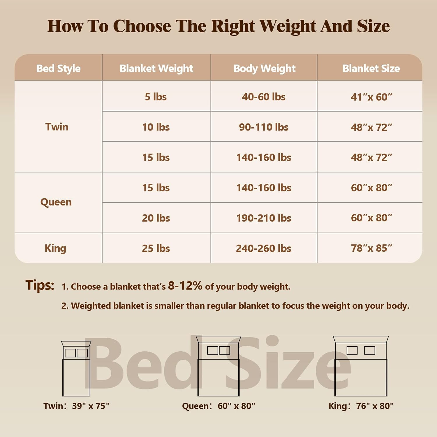 Choose Right Weight: Please choose the blanket that’s 8%-12% of your body weight for ideal comfort. Or refer to our weight and size chart to choose. For your first weighted blanket, we recommend a lighter weight. Most people take about a week to get used to the weight