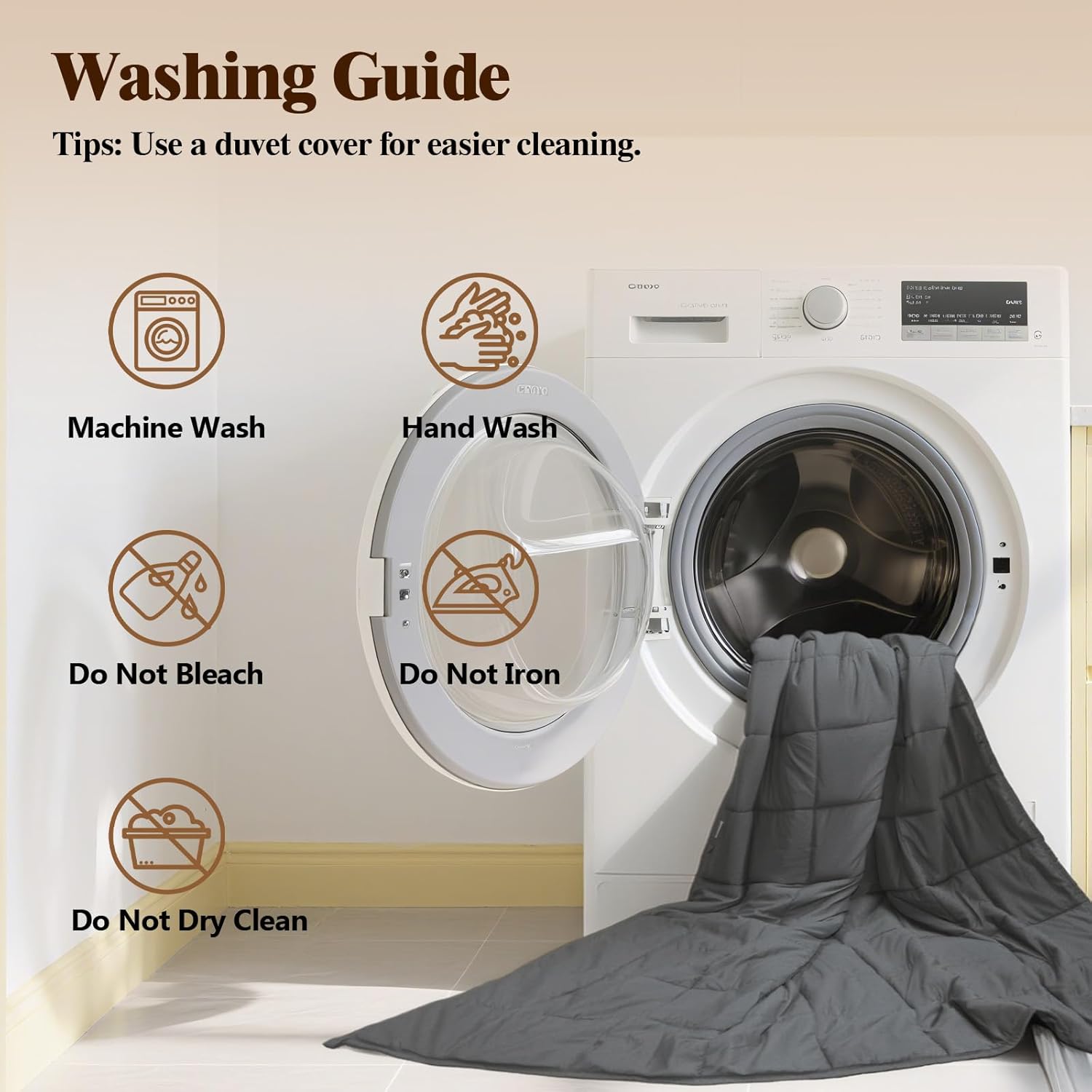 Easy Care: Machine washable in cold water on gentle setting and air dry. Hand wash and air dry is the best way for cleaning. Or use a duvet cover for easier and quick cleanup without washing the heavy blanket itself
