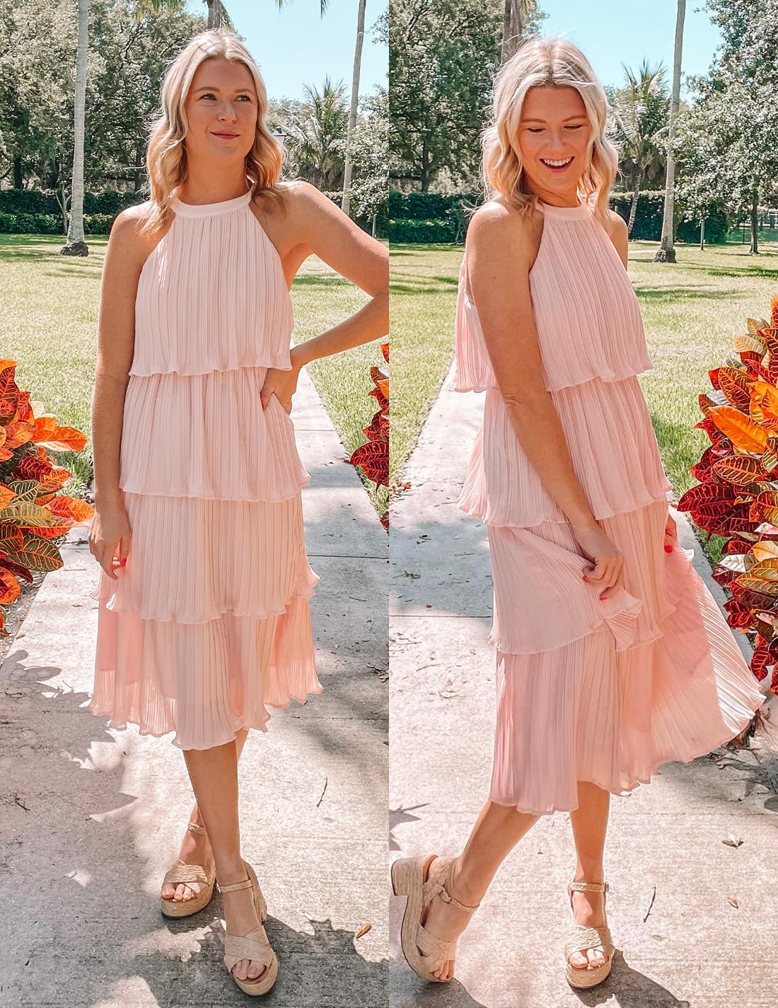 Feature — Halter Neck, Sleeveless, Pleated Chiffon Fabric, Tiered Layers, Solid Color, Midi Length, Flowy Fit.