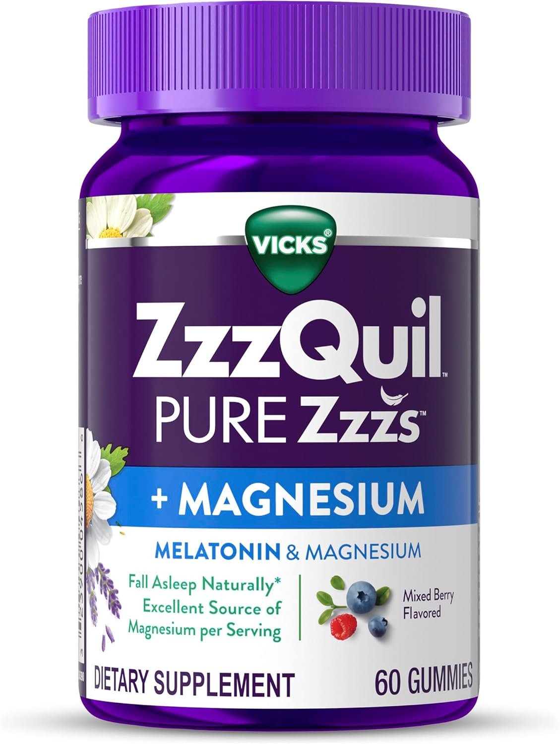 ZzzQuil PURE ZzzsTriple Action Melatonin Gummies are designed to help calm your mind and body before bed.* This dietary supplement sleep aid is formulated with 3x the melatonin (melatonin 6mg per serving, melatonin 3mg per gummy) compared to ZzzQuil PURE Zzzs to boost antioxidant action.* This melatonin and ashwagandha sleep aid works naturally with your body to support your body’s natural sleep cycle and soothe the consequences of occasional stress like sleeplessness, irritability, inability to concentrate*. They contain Ashwagandha, an adaptogenic herb to help you deal with occasional stress.* Ashwagadnha has been used for centuries in traditional Ayurvedic medicine. If you’ve been having occasional sleeplessness , whether it’s caused by stress, changes in your schedule, or just restless thoughts, you may be considering adding a melatonin sleep aid to your nighttime routine as a solution. ZzzQuil PURE Zzzs Triple Action Melatonin gummies are a great choice when you are dealing with occasional sleeplessness because they are drug-free and non-habit forming. This ZzzQuil PURE Zzzs melatonin sleep aid works naturally with your body to support sleep and is specially formulated with 6mg melatonin and ashwagandha. They also include a complementary blend of botanicals including chamomile, lavender, lemon balm, and valerian root. ZzzQuil PURE Zzzs was developed by the trusted experts at Vicks, because everyone deserves a great night’s sleep. ZzzQuil is the World’s #1 Sleep Aid Brand!† *These statements have not been evaluated by the Food and Drug Administration. This product is not intended to diagnose, treat, cure, or prevent any disease. †Source Euromonitor International Limited; Consumer Health 2024 Edition; Sleep Aids, all channels, retail selling price, Global Brand Name ZzzQuil 2023 data